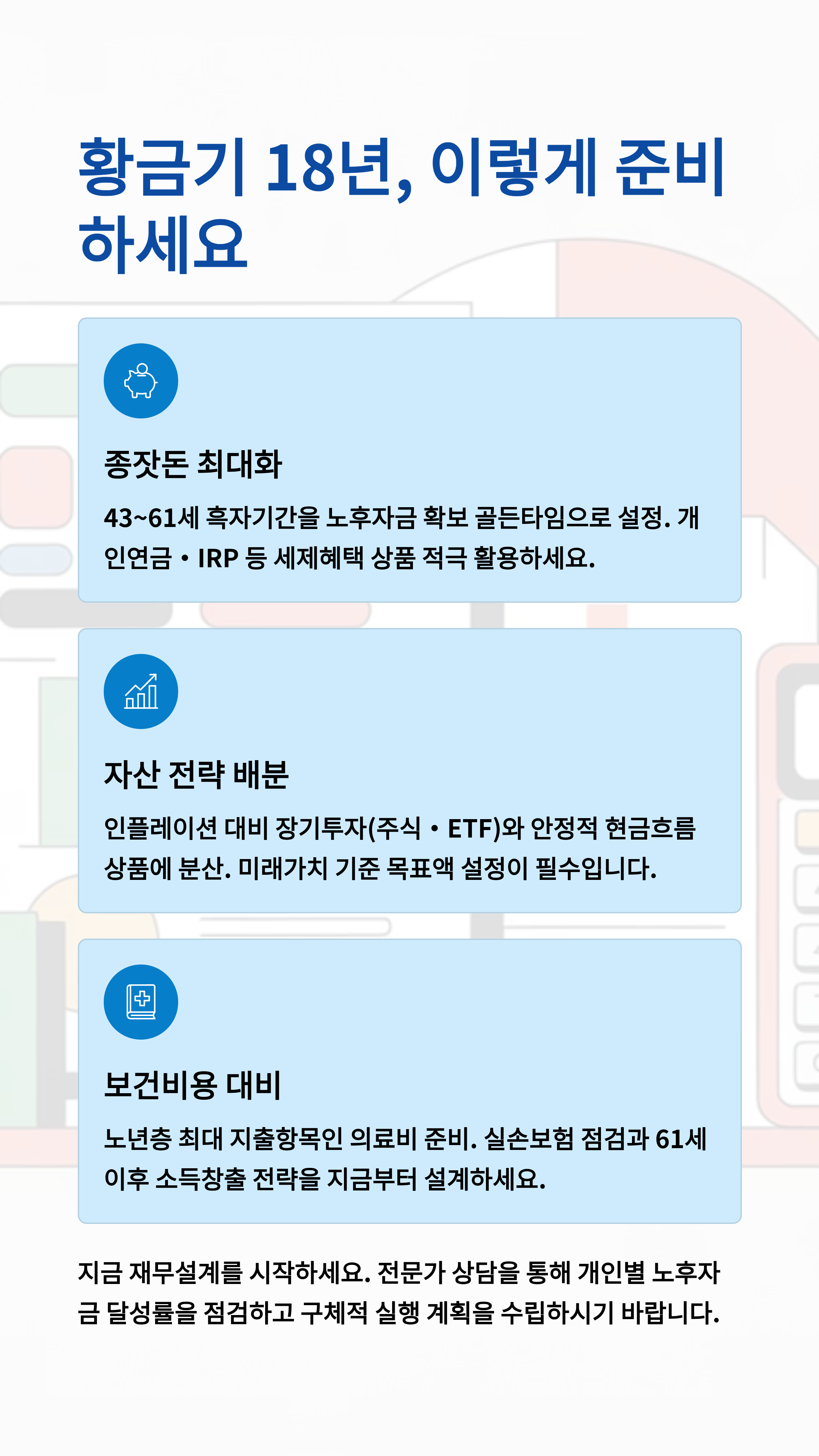 결국 통계청의 분석은 우리에게 **'노후 준비는 빠르면 빠를수록 좋다'**는 강력한 메시지를 던져주고 있습니다. 노동소득이 정점에 달하는 **43세**를 기점으로, 적자 전환이 예상되는 **61세**까지 **골든타임**을 놓치지 않아야 합니다. 글의 핵심 메시지를 다시 한번 강조하세요.