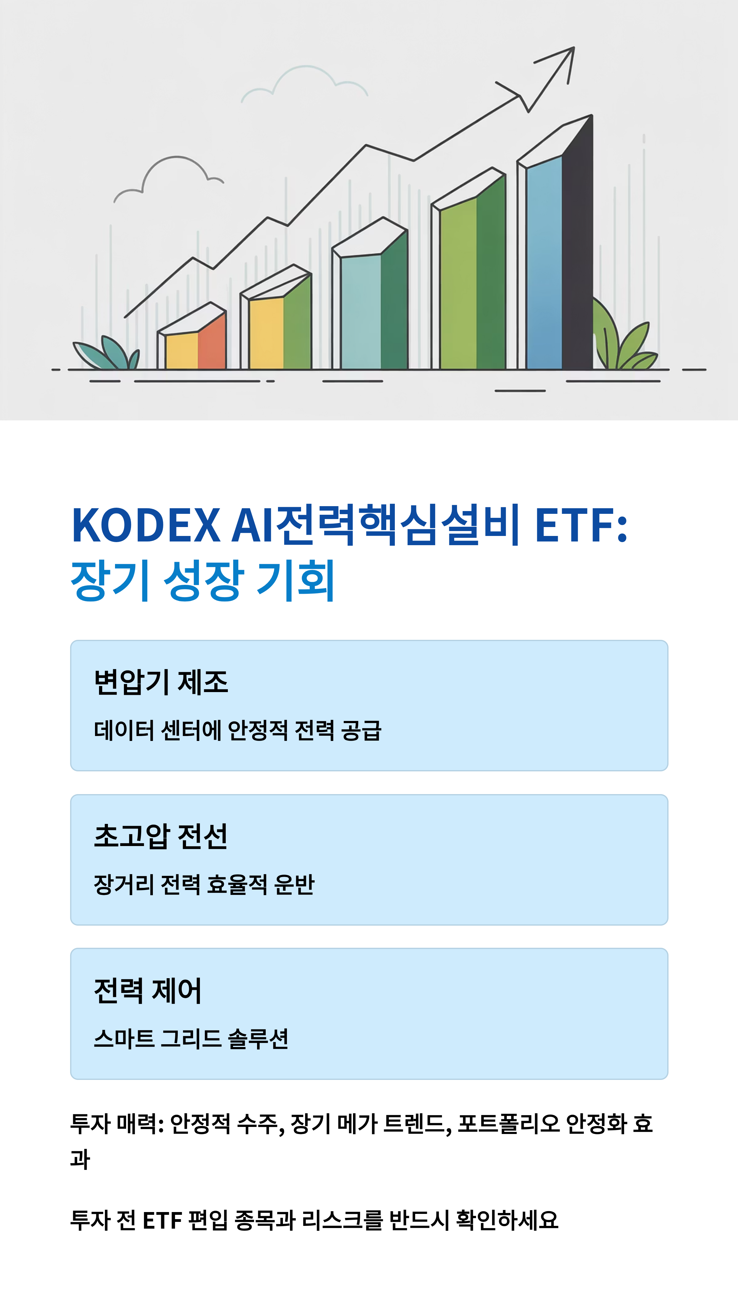 이러한 AI 전력 인프라 확산 트렌드에 발맞춰 출시된 상품이 바로 **KODEX AI전력핵심설비 ETF**입니다. 이 섹션에서는 주제에 대한 더 구체적인 정보나 데이터를 제공하는 것이 좋습니다. 이 ETF는 AI 구동에 필수적인 전력 설비와 관련된 국내 기업들에 집중적으로 투자하여, AI 시대를 관통하는 핵심 테마에 분산 투자할 수 있게 해줍니다.