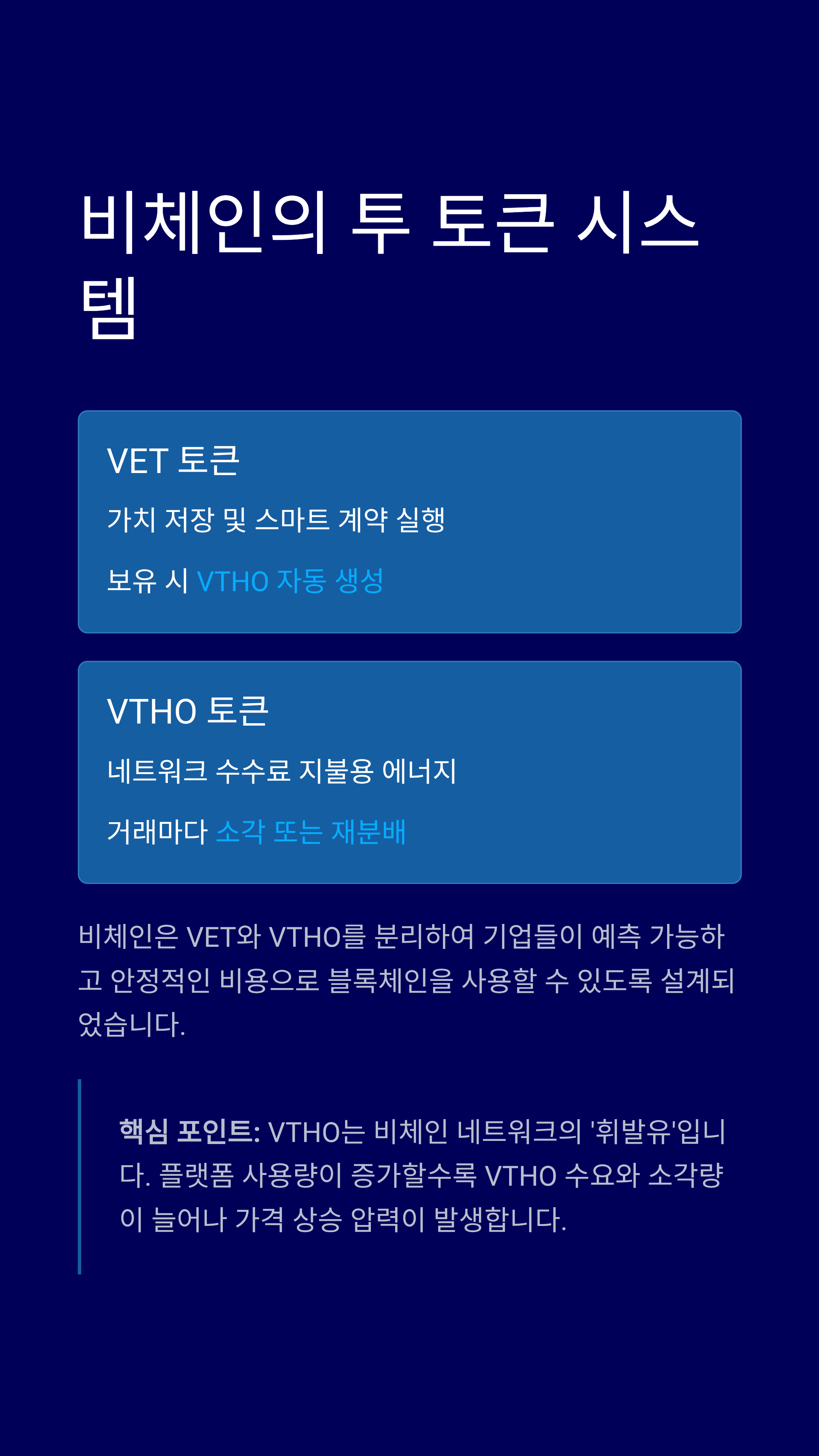 비체인 플랫폼은 **VET(가치 저장 및 스마트 계약 실행)**와 **VTHO(네트워크 수수료 지불)**라는 두 개의 토큰으로 나뉘어 운영됩니다. 이렇게 토큰을 분리하는 이유는 네트워크 비용을 예측 가능하고 안정적으로 유지하여 기업들이 부담 없이 비체인 블록체인을 사용할 수 있도록 하기 위함이에요.