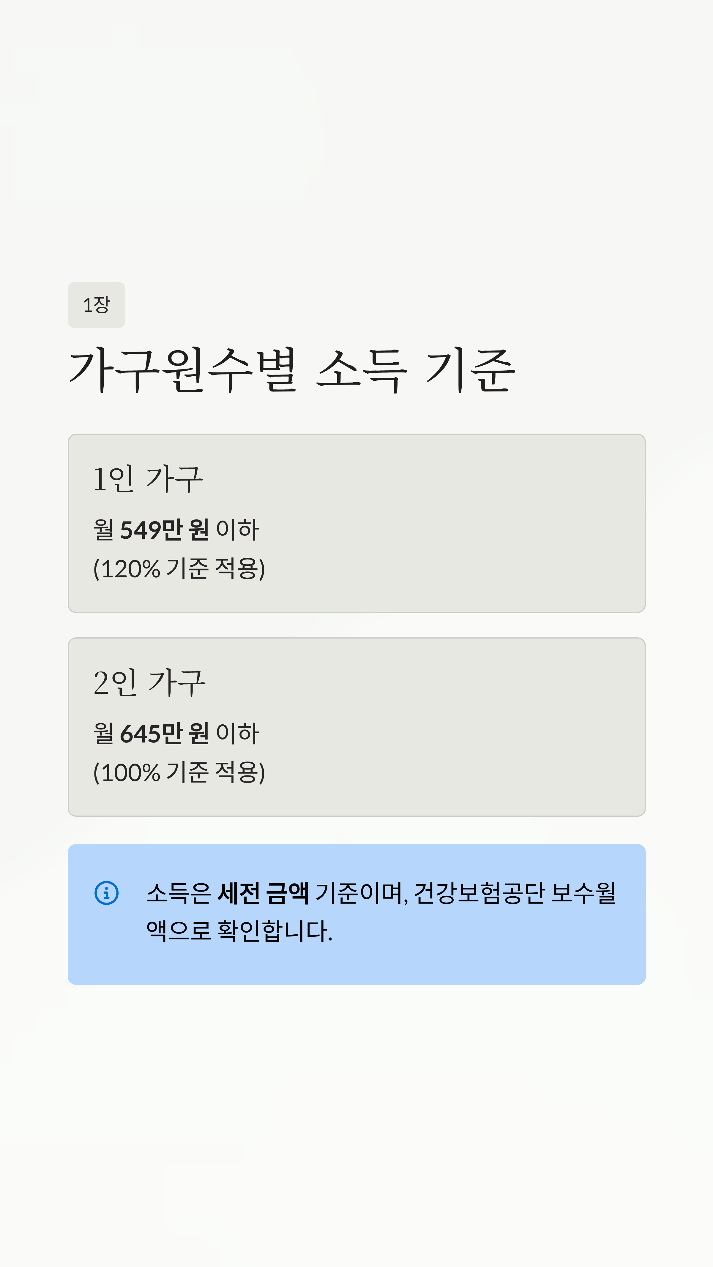 1) 소득 체크: 1인 가구 120% 기준인 약 549만 원보다 현저히 낮아 통과!