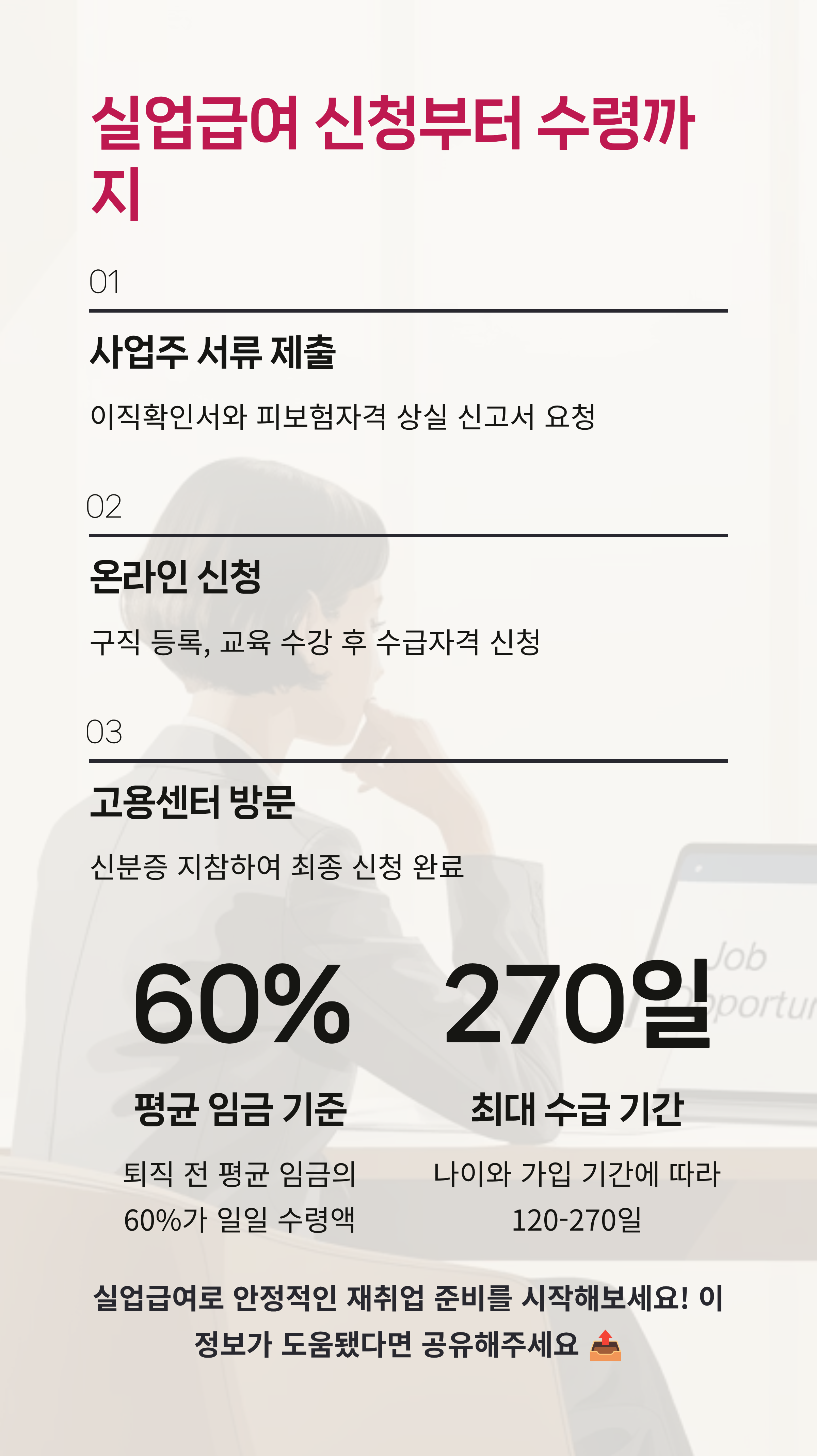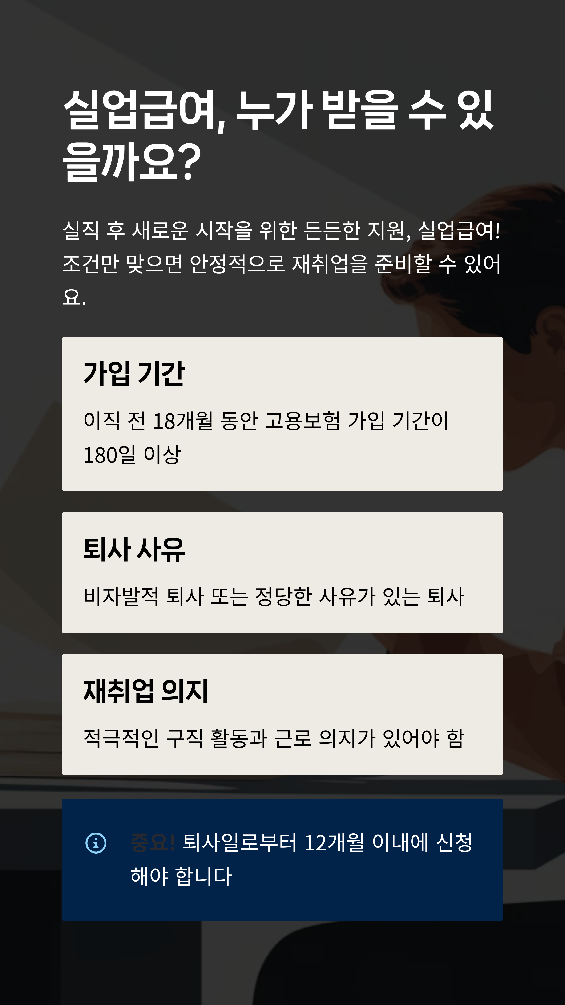 가장 먼저 궁금하실 부분이죠? 실업급여는 누구나 받을 수 있는 게 아니라, 몇 가지 조건을 충족해야 받을 수 있답니다.