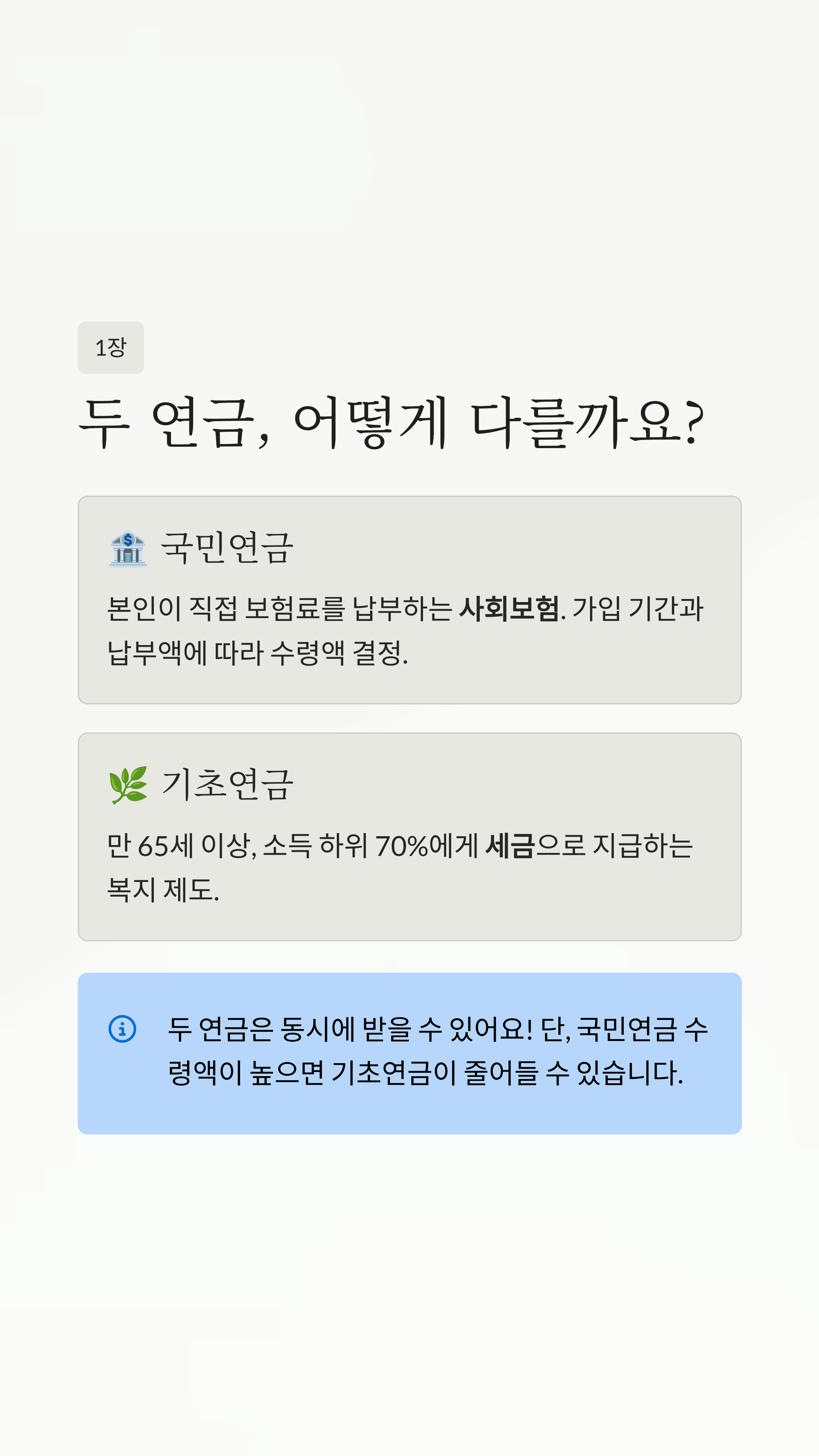 - 국민연금은 '저축', 기초연금은 '복지'입니다. 내가 낸 돈을 받느냐, 국가 세금을 받느냐의 차이예요.