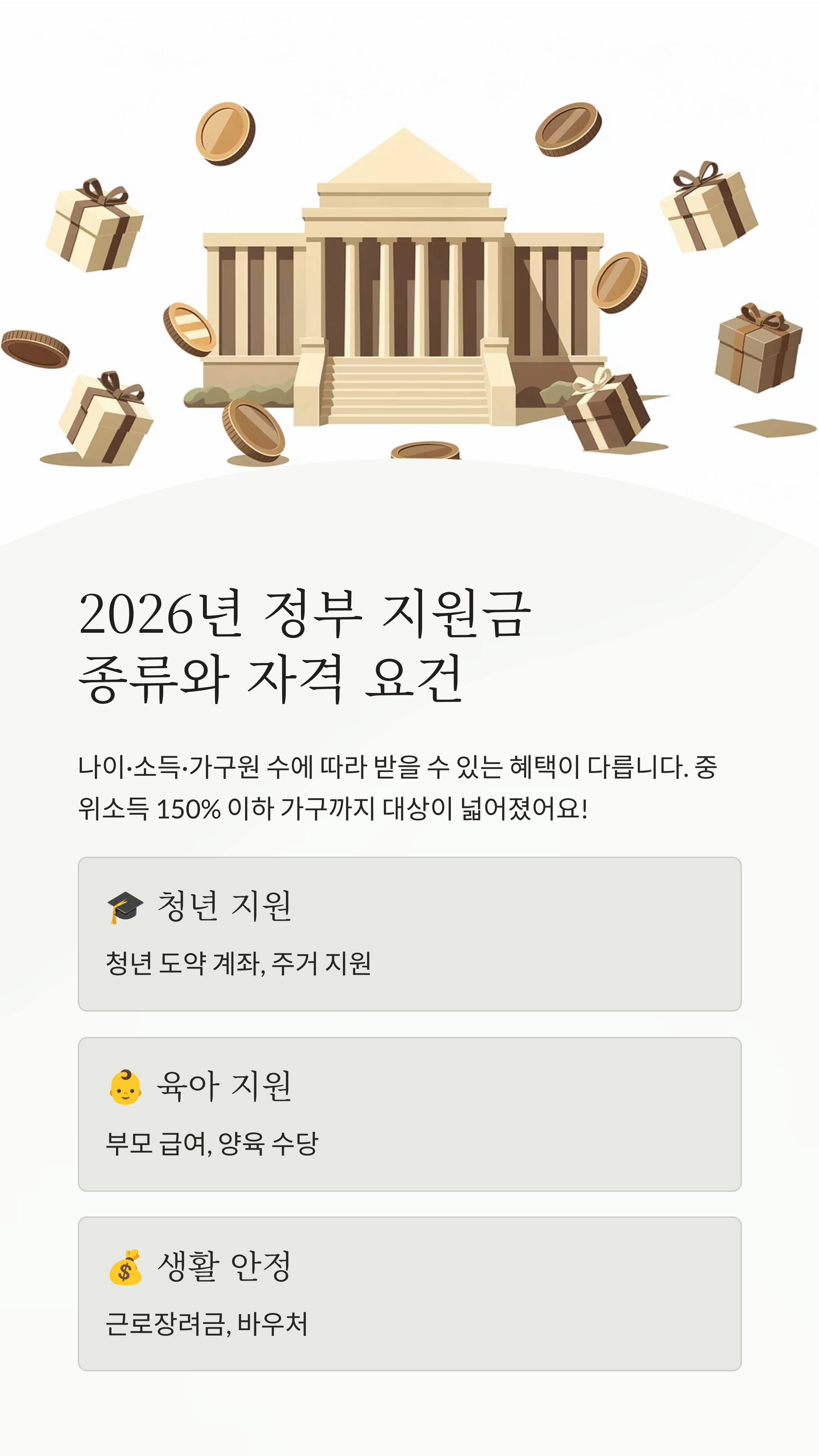 그래서 오늘은 제가 여러분의 소중한 권리를 되찾아드리기 위해, 2026년 기준 가장 핵심적인 지원금 혜택들과 그 신청 방법을 아주 쉽게 풀어드리려 합니다. 이 글을 끝까지 읽으시면 지금 바로 스마트폰을 켜고 지원금을 신청하고 있는 본인의 모습을 발견하시게 될 거예요!