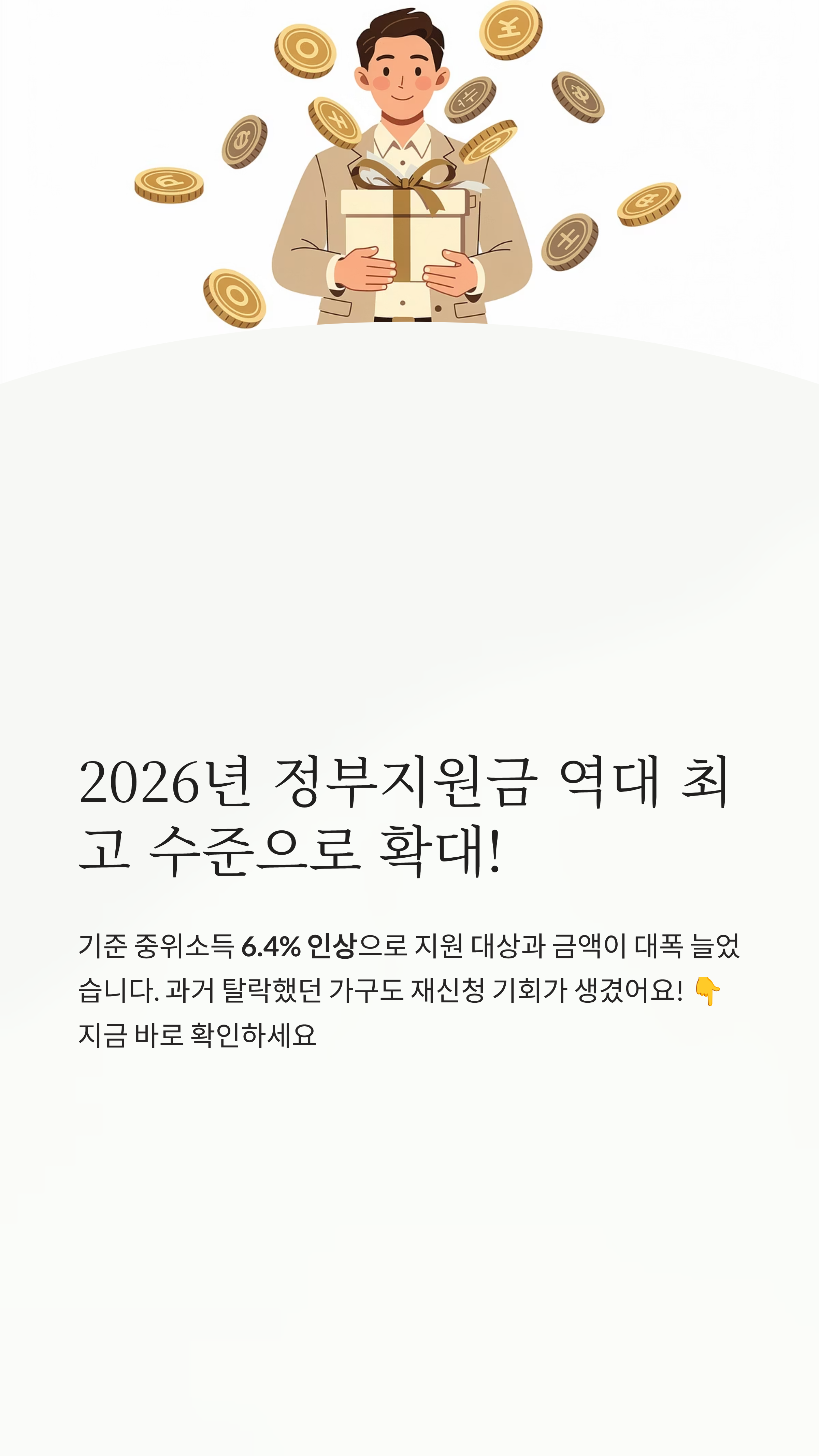 2026년 기준 중위소득은 작년 대비 약 6.4% 인상되었습니다. 이는 최근 5년 중 가장 높은 인상 폭으로, 내가 작년에 아쉽게 탈락했다면 올해 반드시 다시 신청해봐야 하는 이유입니다!